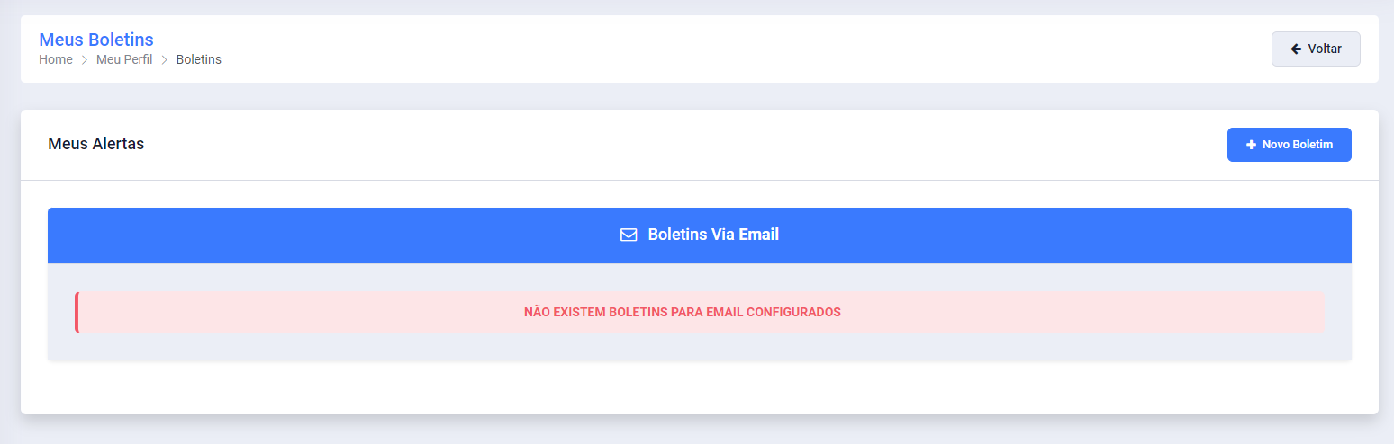Para cadastrar um novo alerta vá em "Meu perfil", clicando no seu nome e e-mail no canto superior direito da tela. Depois abra "Boletins".