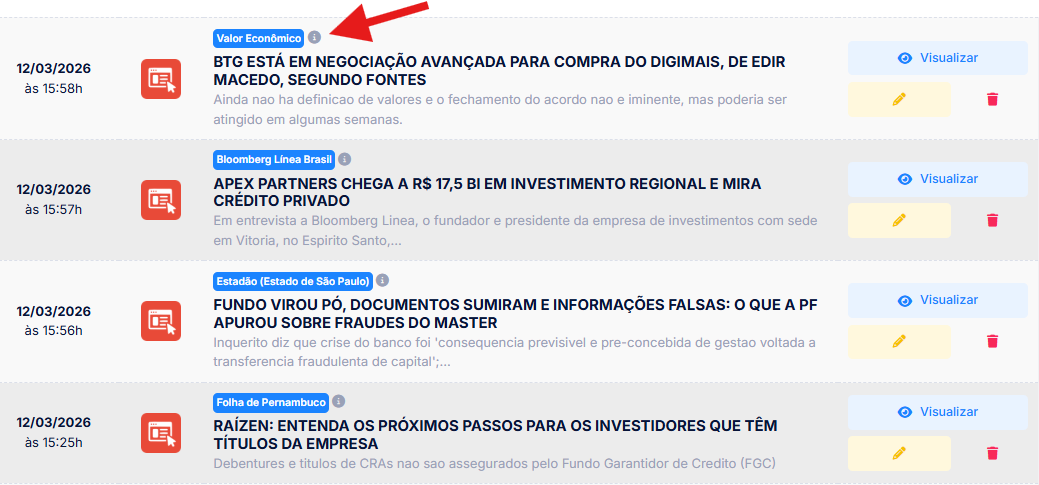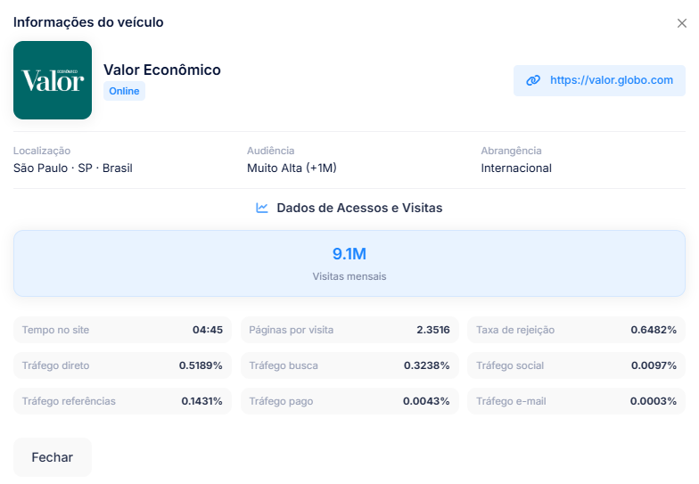 O Simpling IA apresenta um painel completo com informações e métricas sobre cada veículo monitorado pela plataforma. Esse recurso permite visualizar dados relevantes sobre o site onde uma notícia foi publicada, ajudando sua equipe a entender melhor o potencial de alcance daquela menção.