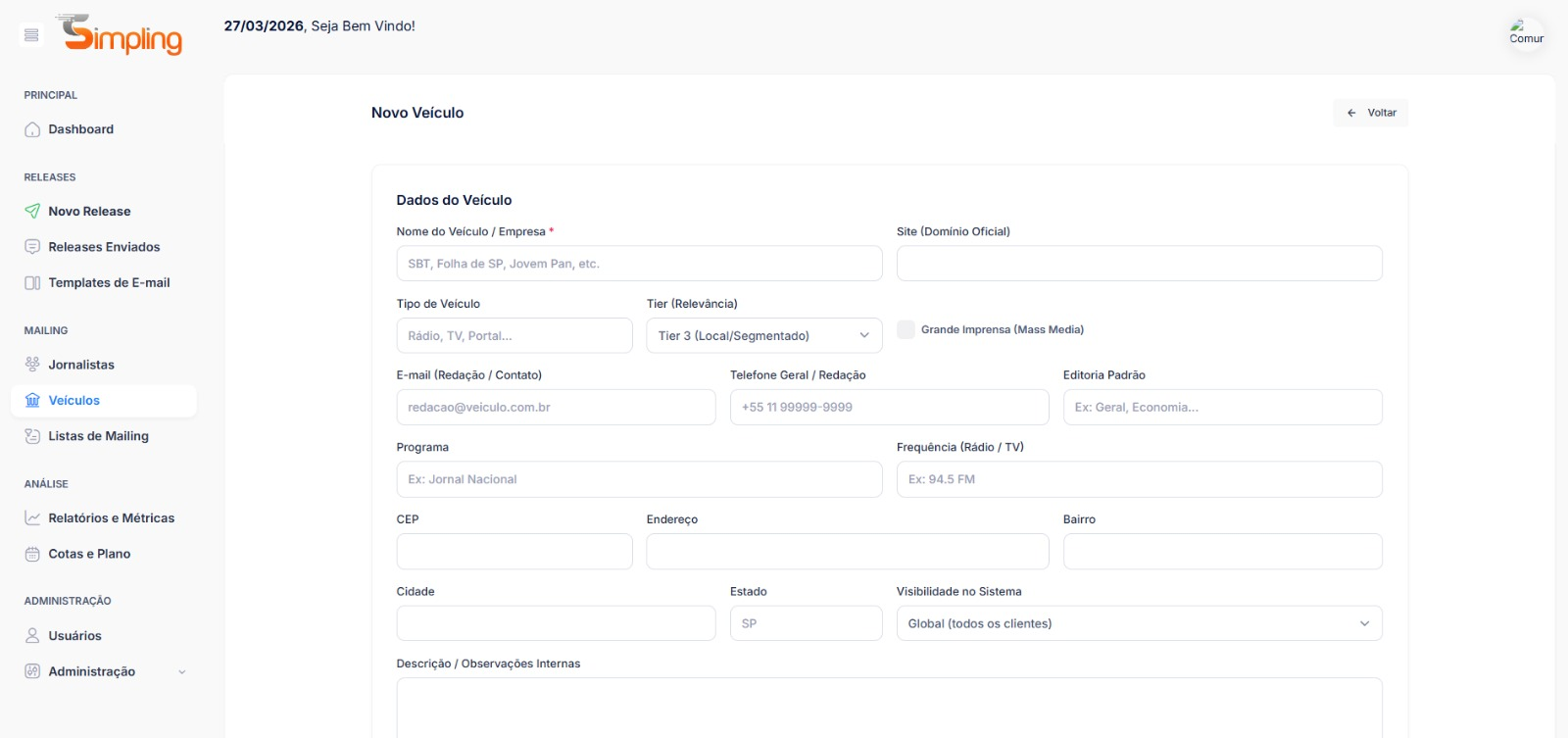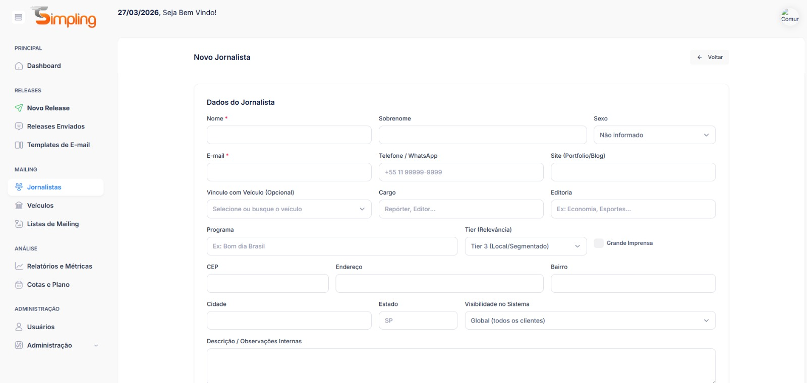 O Simpling Press Hub separa os contatos de imprensa em dois cadastros distintos: Jornalistas (as pessoas) e Veículos (as empresas de comunicação onde eles trabalham). Essa separação permite uma segmentação muito mais precisa na hora de montar seu mailing.