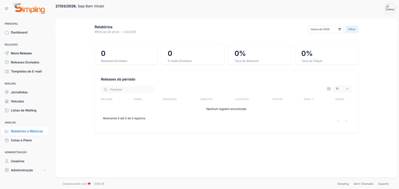 A tela Relatórios e Métricas centraliza o desempenho de todos os releases enviados no período selecionado. Use esses dados para entender quais releases tiveram melhor alcance, quais horários funcionam melhor e como está a saúde da sua lista de contatos.